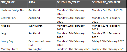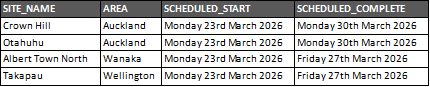 Planned One NZ network maintenance is scheduled for the following areas impacting RBI Wireless and Urban Wireless broadband services. The dates provided are subject to change, we will update this page in the event of any changes to the scheduled dates should we be notified. Please check this page regularly for any changes.
